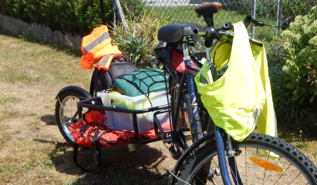 J'ai voulu partir avec un vélo de course et emporter ma tente Quechua (Tente 2 Seconds). Il s'agèt d'un objet qui ne rentre pas dans une sacoche ou un sac à dos. Donc il fallait une remorque. Malheureusement la tente Quechua a été broyée; (coincé dans l'axe de la remorque).